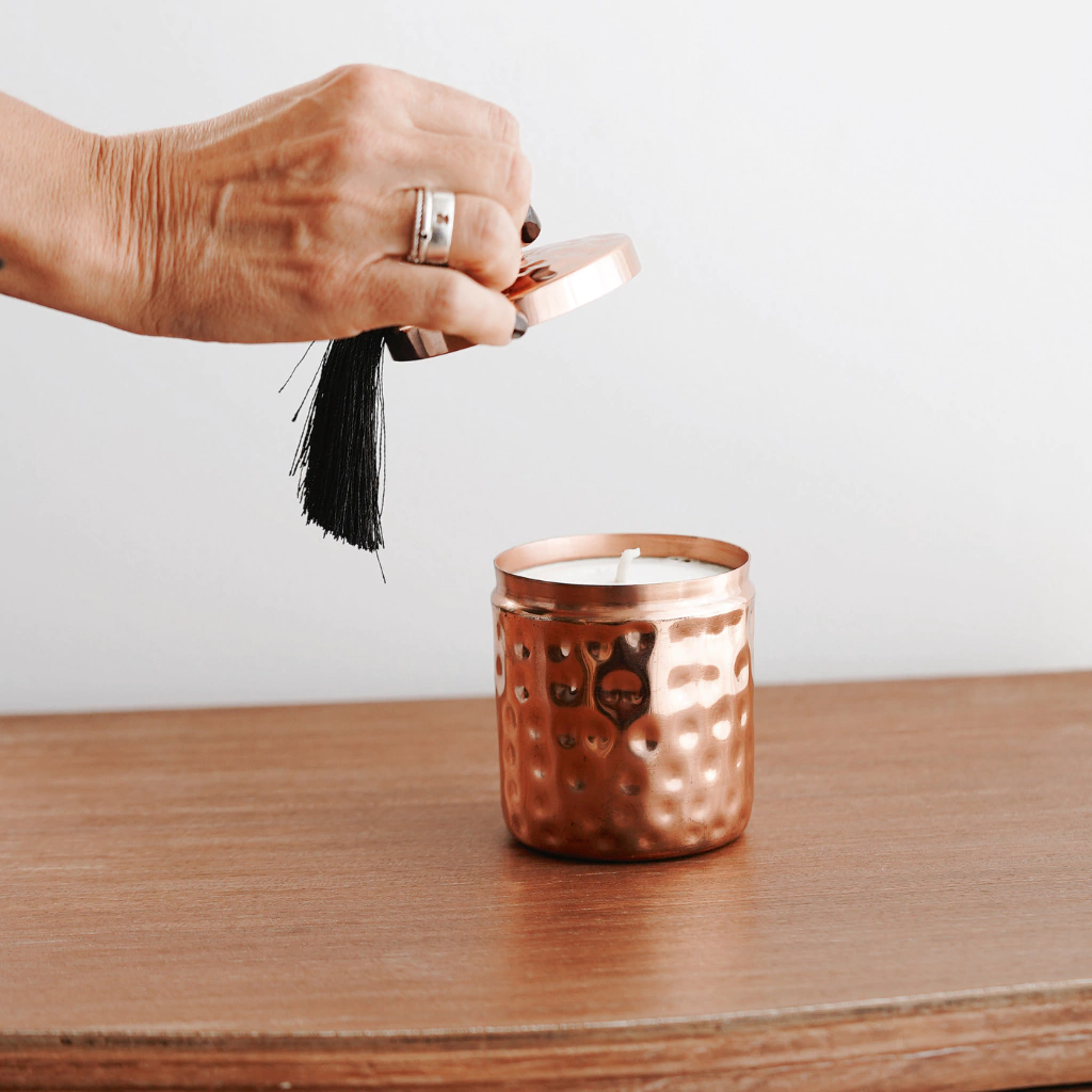 Vela de cera de soja hecha a mano en envase de metal rosa dorado con tapa y borla negra de hilos de seda , 300grs
